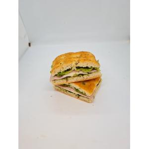 Pain focaccia au romarin, mortadelle a la pistache , pesto , mozzarella , salade romaine