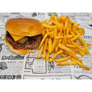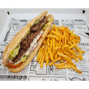 Pain tradition, steak, sauce au choix, salade, tomates et oignons rouges, frites