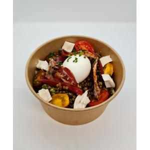 Salade, lentilles, oeuf mollet, lard, pickles d'oignons rouges et fromage de chèvre
